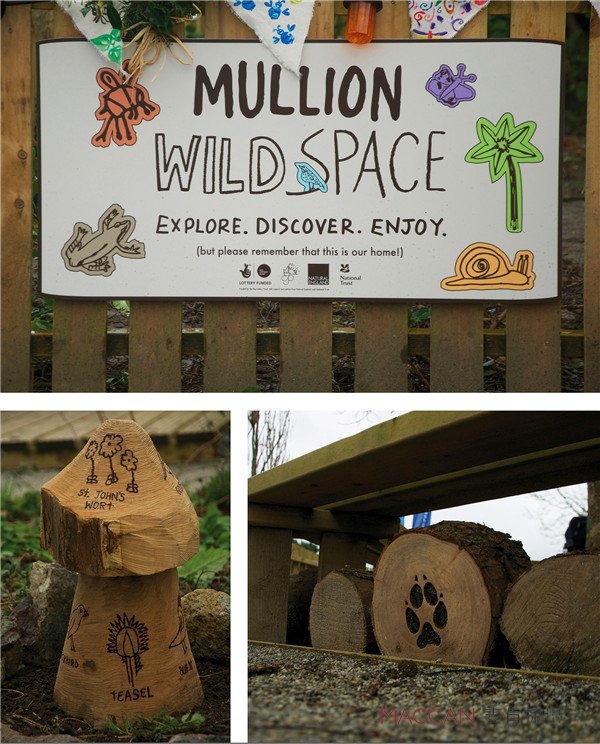 每個入口都有一個木制蘑菇雕像,上面有不同的植物或動物插圖,使用工藝鐵焊將設計燒焦到木材中。是不是很有童趣呢。