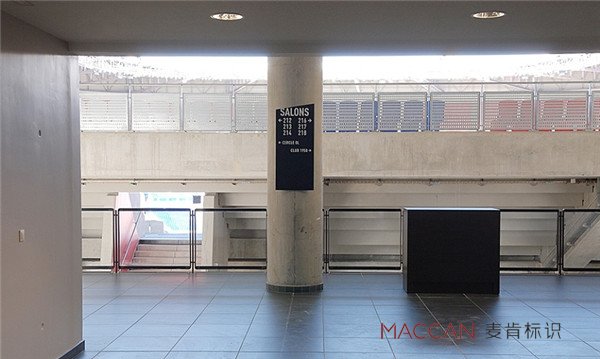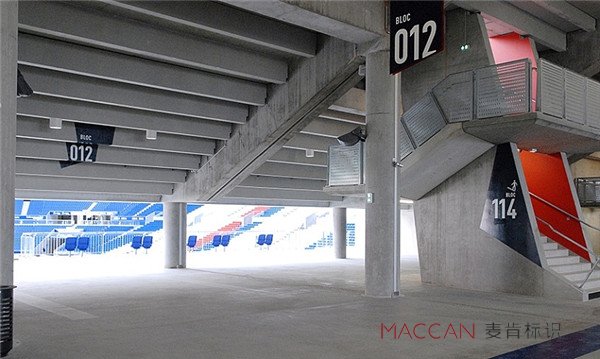 場(chǎng)館內(nèi)導(dǎo)向標(biāo)識(shí)的主要作用是幫助觀眾對(duì)號(hào)入座,并指示樓梯、電梯、衛(wèi)生間等公共服務(wù)設(shè)施。根據(jù)位置不同,可分為看臺(tái)標(biāo)識(shí)和集散廳標(biāo)識(shí)兩類(lèi)。