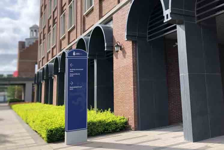 借鑒并延續(xù)了英國哈羅公學的園林設計理念,麥肯設計師融入“環(huán)境育人”的理念,以其極具辨識度的雄獅形象——起源于英國哈羅公學創(chuàng)辦人John Lyon的家族徽章作為設計的圖形基礎(chǔ),體現(xiàn)出學校的英倫氣質(zhì),打造具有英式風情的導視效果。
