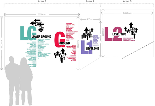 Galeries的導視系統設計有兩個目的:一是基本的導視系統功能,起到指引顧客行走方向的目的,不至于讓人們在購物的過程中迷路;二是讓人們感受到一定的商業氛圍。