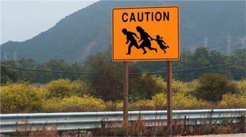 在美國(guó)高速公路你可以看到一家三口手牽手拉著跑的街道路邊標(biāo)識(shí)牌,代表的意思是美國(guó)有很多非法移民,因?yàn)闆](méi)有有效身份證,因此你在高速公路上開(kāi)車,就要注意到這些常常為了躲避檢查而驚慌逃跑的非法移民。