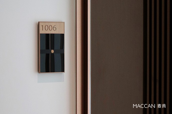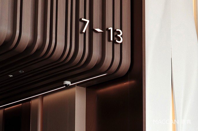 深色條形木紋材質搭配發光字,淺色木紋基底搭配金屬字與金屬邊框,搭配白色背景墻,整體呈現出——“雅致、內斂、柔和” 的視覺效果,是麥肯標識在商業辦公空間領域的又一力作。